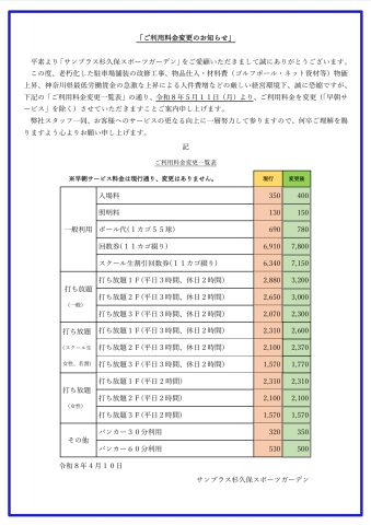 この度、老朽化した駐車場舗装の改修工事、物品仕入・材料費(ゴルフボール・ネット資材等)物価上昇、神奈川県最低労働賃金の急激な上昇による人件費増などの厳しい経営環境下、誠に恐縮ですが、「ご利用料金変更一覧表」の通り、令和8年5月11日(月)より、ご利用料金を変更(「早朝サービス」を除く)させていただきますことをご案内申し上げます。
